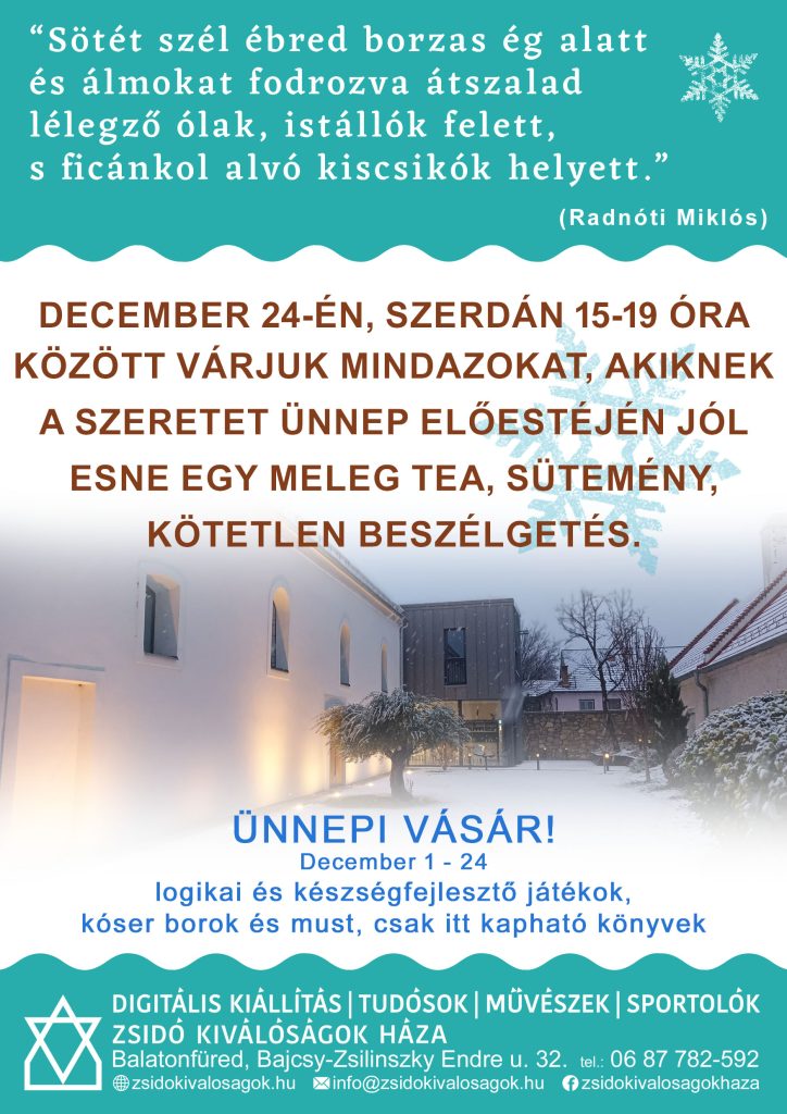 December 24-én délután és kora este várják azokat, akiknek a szeretet ünnep előestéjén jól esne egy meleg tea, sütemény és baráti beszélgetés a Zsidó Kiválóságok Házában.